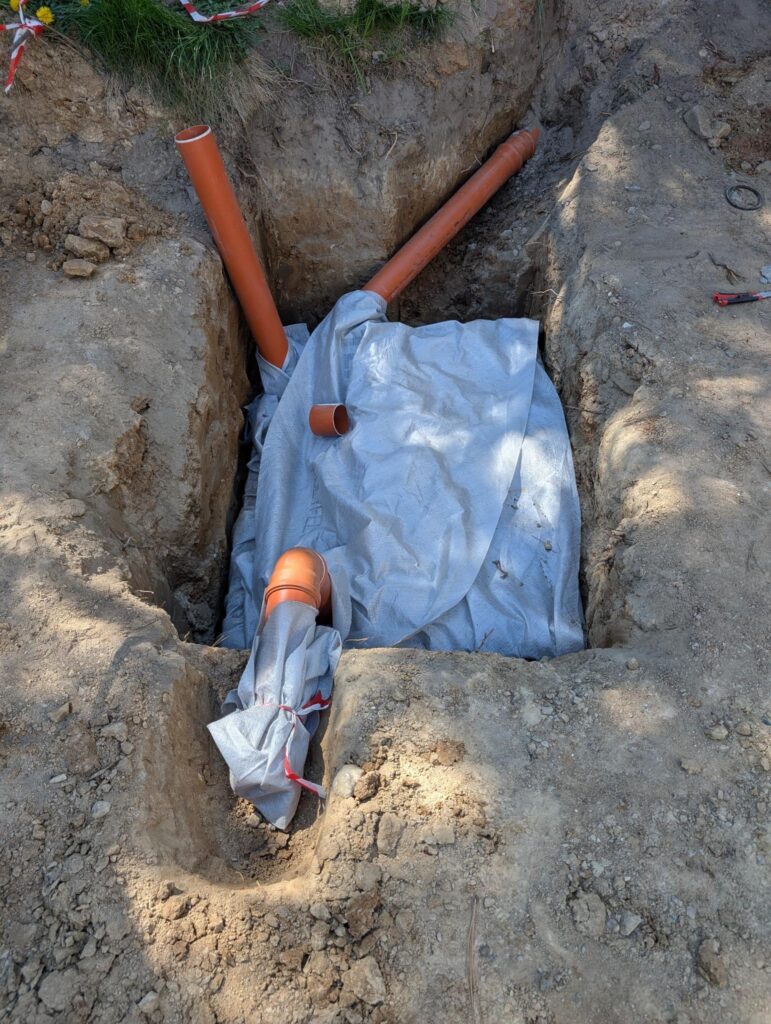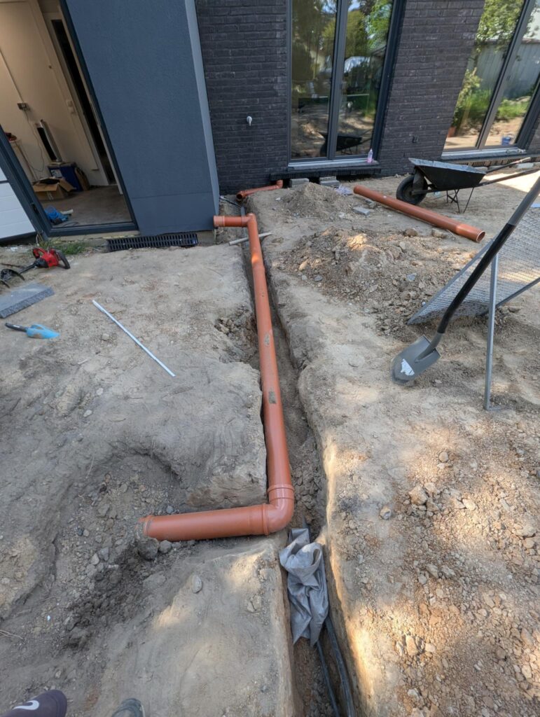 Hinter dem Haus wurde inzwischen einige Rigolen verbudelt, um die Regenwasserversickerung zu ermöglichen. Auch die Entwässerungsrinnen vor den Terassentüren sollen daran angeschlossen werden.